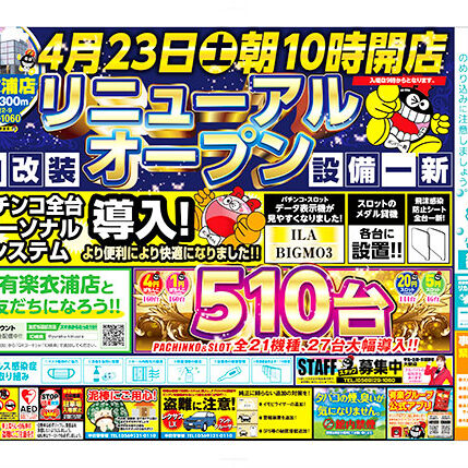 皆様、お待たせしました! 本日、4月23日 土曜日!有楽衣浦店 新装開店しました! 本日のみ9時入場、10時遊技スタートとなっております。 明日からは通常通り、9時開店22時50分閉店です! 4月20日より3日間の改装期…